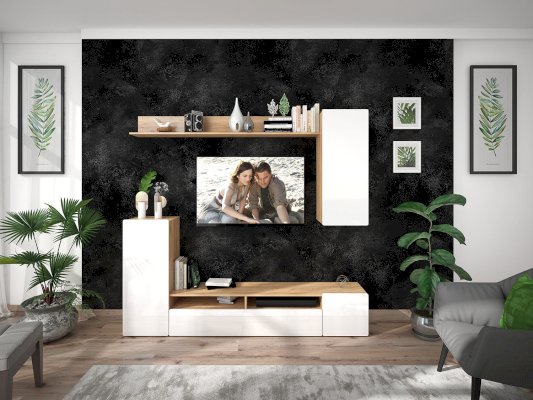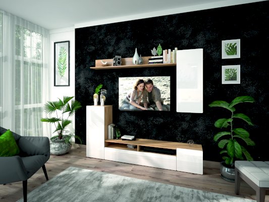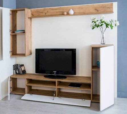 - Гостиная состоит из двух частей: монолитной напольной и навесной.