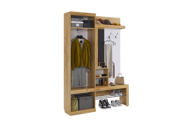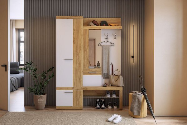 «Алекс» - прихожая 3 в 1. Это открытые ниши для размещения одежды, сумок на металлические крючки и модное решение из хромированных трубок для хранения повседневной обуви. Закрытый шкаф-гардероб для несезонной обуви и верхней одежды на плечиках. А так же ниша-трюмо с зеркалом и полками сбоку станут незаменимыми помощниками в наведении утреннего марафета. В закрытом шкафу под зеркалом можно хранить средства для чистки обуви, фен и другие нужные вещи. Прихожая «Алекс» - в ней поместится ВСЕ и даже Больше!