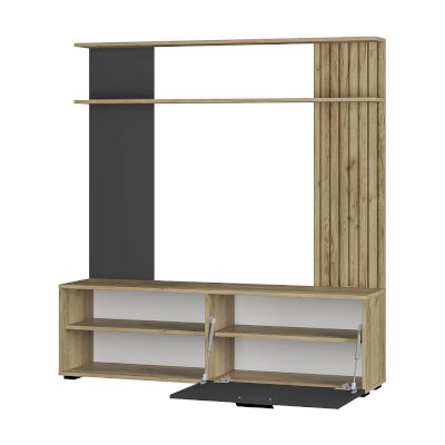 Гостиная "Мишель" - это модель с универсальной конструкцией для современного дома. Фасады в глубоком оттенке "графит" будут отлично контрастировать со стенами в нейтральных или насыщенных холодных тонах. Корпус и поверхности, выполненные в цвете "крафт", хорошо гармонируют с фотопечатью, имитирующей деревянные рейки.